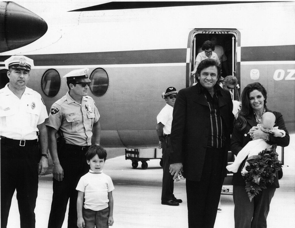 Johnny Cash, June Carter Cash and six-month-old John Carter Cash arriving at Capitol Airport via Ozark Airlines to perform at the Illinois State Fair, August 1970. Security for Cash was (left) Sgt. C. Gilbert and (right) PTRM James McIntyre, Jr.